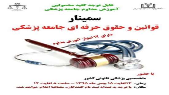 سمینار قوانین و حقوق حرفه ای جامعه پزشکی 15 و 14 بهمن ماه با حضور اساتید برجسته پزشکی قانونی کشور در دانشگاه برگزار می شود.