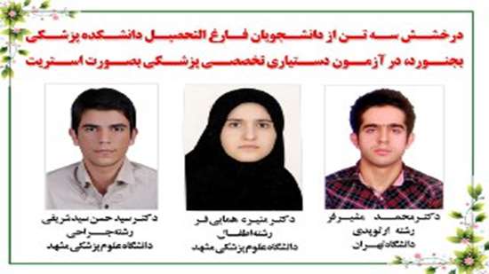بر پایه این خبر دکتر محمد مشیرفر در رشته ارتوپدی دانشگاه تهران، دکتر منیره همایی فر در رشته اطفال دانشگاه علوم پزشکی مشهد و دکتر سید حسن سید شریفی در رشته جراحی دانشگاه علوم پزشکی مشهد پذیرفته شدند.
