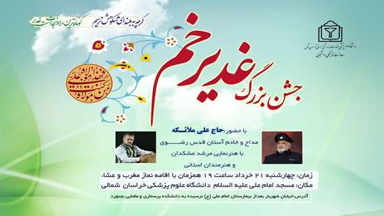 جشن بزرگ غدیر با حضور حاج علی ملائکه ( مداح و خادم آستان قدس رضوی) وهنرنمایی مرشد مشکدان و هنرمندان استانی
