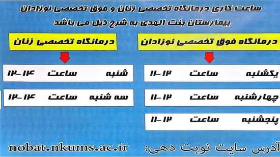 ساعات کار درمانگاه تخصصی زنان و فوق تخصصی نوزادان بیمارستان بنت‌الهدی بجنورد