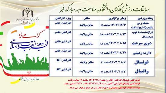مسابقات ورزشی کارکنان دانشگاه بمناسبت دهه مبارک فجر با همکاری واحد تربیت بدنی دانشگاه برگزار میشود.