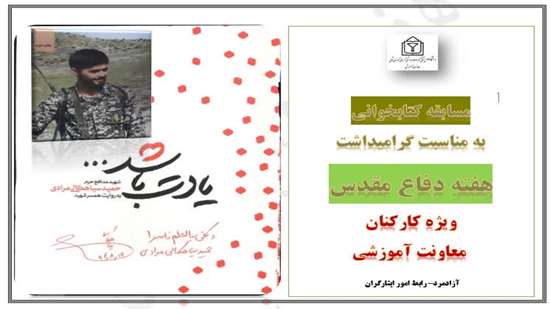 امور ایثارگران معاونت آموزشی دانشگاه، به مناسبت هفته دفاع مقدس، مسابقه کتابخوانی «یادت باشد» با روایتی از خاطرات همسر شهید مدافع حرم «حمید سیاهکالی مرادی» با نویسندگی محمدرسول ملاحسنی را برگزار می نماید.