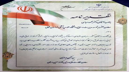 « به پاسداشت عملکرد مطلوب و همکاری بسیار خوب جنابعالی با خزانه معین استان در شاخص های اعلامی توسط وزارت امور اقتصادی و دارایی ، برخود لازم می دانم از تلاش ها و زحمات صورت گرفته سپاس و قدردانی نموده ، سربلندی و موفقیت جنابعالی را از خداوند متعال مسالت می نمایم»