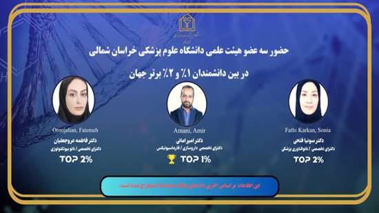 معاون تحقیقات و فناوری دانشگاه علوم پزشکی خراسان شمالی گفت: بر اساس آخرین گزارش منتشر شده توسط گروه تحقیقاتی دانشگاه استنفورد با همکاری مؤسسه الزویر در سال ۲۰۲۵ (رتبه‌بندی جهانی Scopus) سه عضو هیئت علمی دانشگاه علوم پزشکی خراسان شمالی در میان دانشمندان یک درصد و دو درصد برتر جهان قرار گرفتند.